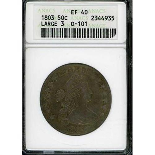 <b>1803 Draped Bust Half Dollar. Large 3. O-101. ANACS graded EF40.</b> A desirable high grade circulated example of the Large 3 variety, a design similar to the other silver denominations this year. A draped bust figure of Liberty is on the obverse, while an eagle posed in "heraldic" style is on the reverse. Well struck examples like this rarely see the light of day <b>(PCGS # 6066)</b>