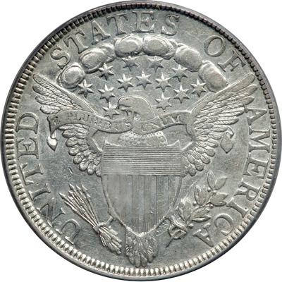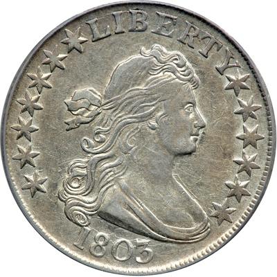 1803 Draped Bust Half Dollar. Large 3. . O-103, R-3. PCGS graded AU-50. An untoned example with some residual luster in the devices. Attractive light to medium gray, choice rims, strong devices. As usual for O-103, there is a faint die crack on the reverse beginning at ST then through clouds below TATE and upwares at ES. Pop 18 (PCGS # 6066) .