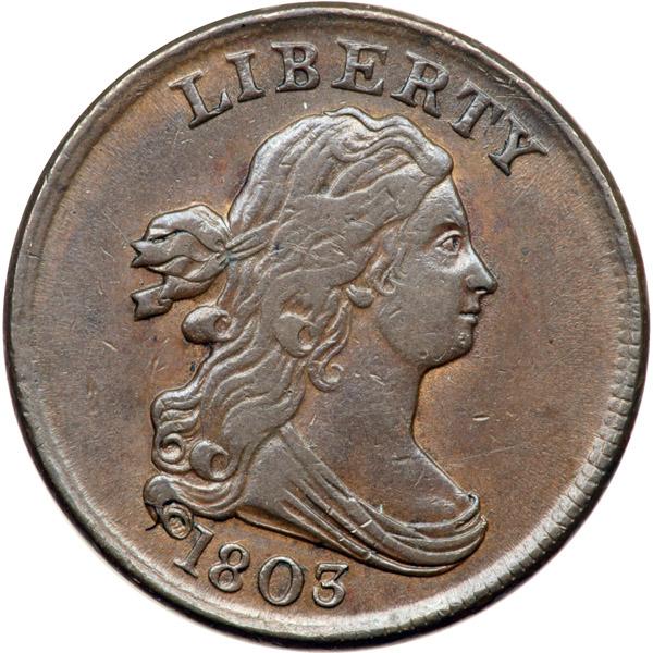1803 C-1 R1 EF40. Slightly sharper but there are a few shallow contact marks on the numerator and a small nick on the edge above the B in LIBERTY. Otherwise this piece is choice and offers outstanding eye appeal. Glossy steel and chocolate brown with lots of frosty lighter brown and golden tan faded down from mint color in protected areas on both sides. MDS, Manley state 2.0. A light die crack extends through the first T in STATES to AM in AMERICA. Davy #03.1.13.