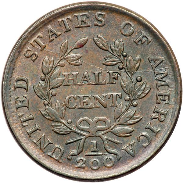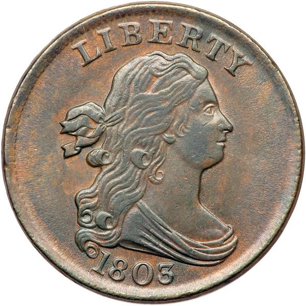 1803 C-1 R1 MS60. Lustrous olive and chocolate brown with traces of frosty lighter brown and tan faded down from mint color in protected areas, especially on the obverse. The surfaces are very attractive, free of any spots or other distractions. The best identifying marks are a very tiny pinprick inside the C in CENT and a subtle spot of reddish chocolate toning on the leaf below TE in STATES. LDS, Manley state 3.0. A halo-like aura surrounds Ms Liberty and the branch die crack at LF passes through the N in UNITED to the dentils above. The reverse is rotated 15 degrees CW. Removed from a PCGS slab graded MS62BN (old green PCGS label included, #1060.62/4139697). Weight 86.1 grains.
