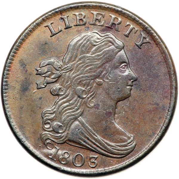 1803 C-3 R2 EF45. Sharpness near mint state but there is a splash of dark reddish chocolate toning on the lower left of the reverse, another on the first A in AMERICA, plus a couple tiny spots of similar toning on the obverse. Traces of extremely fine roughness can be found in a couple of these dark splashes. The remainder of the planchet displays attractive glossy chocolate and steel brown toning with underlying lustrous lighter steel brown toning in protected areas. MDS, Manley state 3.0, with obvious swelling at the 18 in the date.