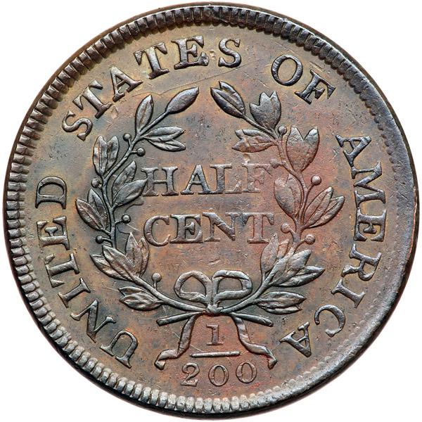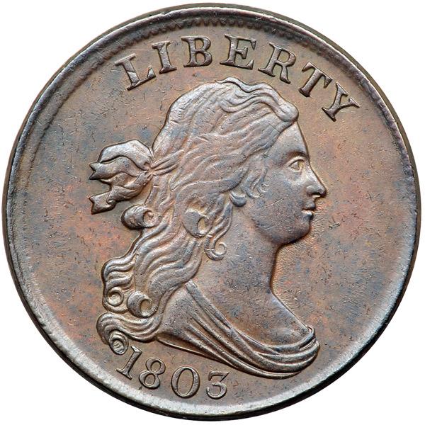 1803 C-4 R4 EF45+. Very attractive lustrous steel and chocolate brown mixed with frosty lighter brown toning on both sides. A subtle hint of reddish chocolate toning covers the wreath under AME and the fraction. The fields are smooth and there are only a few trivial marks. These include a tiny rim nick over the right side of the I in LIBERTY, a shallow tick under the first T in STATES, and another over the top of the F in HALF. Just a very light touch of friction on the highest points from mint state. The reverse is rotated 135 degrees CW, the only example known to this cataloger with this rotation. A beautiful example, close to AU50. At the lower end of the condition census which includes only a single mint state coin. Weight 82.9 grains.