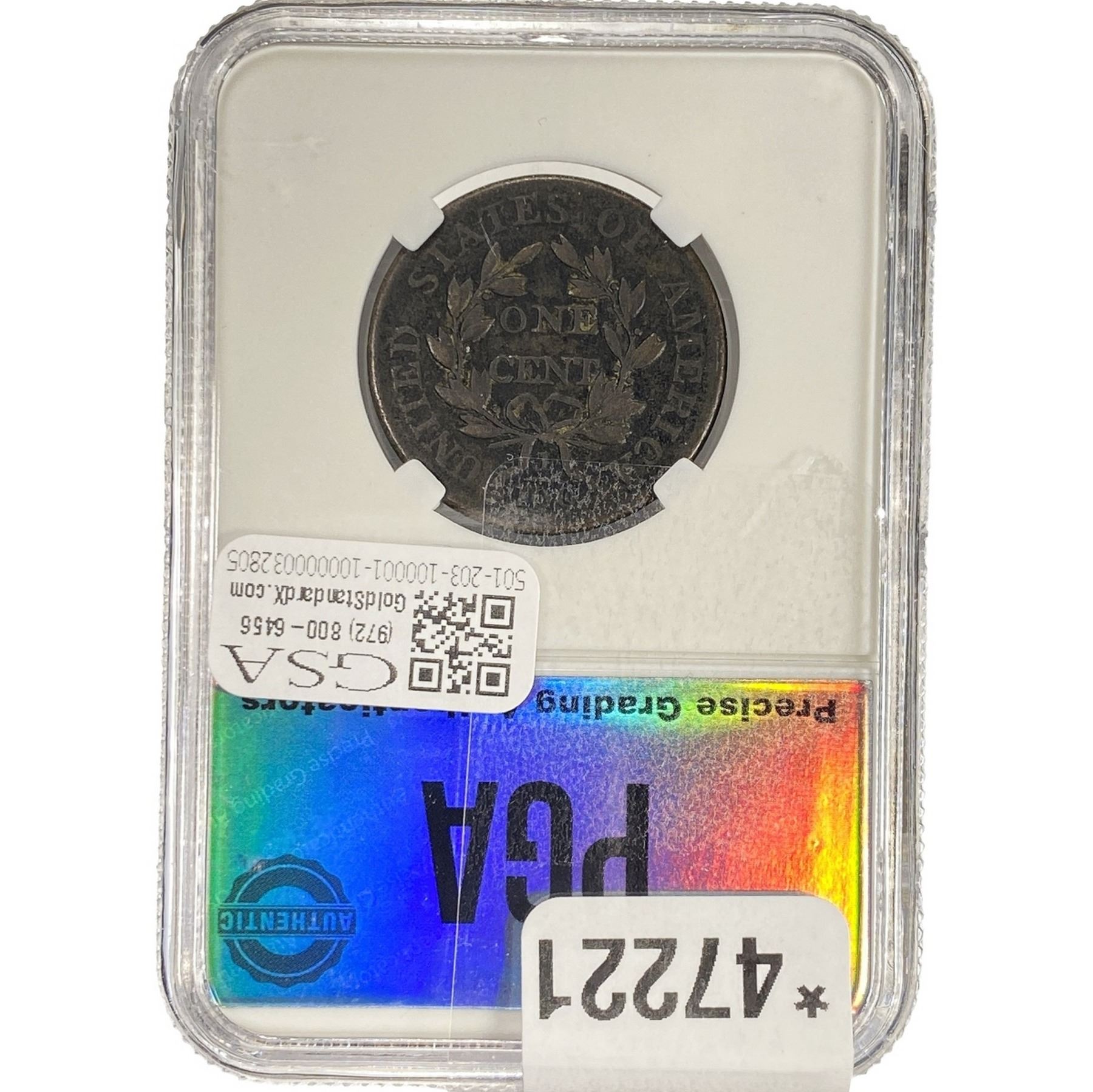 e. Coins sold referencing a third-party grading service are sold “AS IS” without any express or implied warranty, except for a guarantee by GSA that they are genuine. Removal or alteration of the holder, voids all of Bidder’s claims concerning that Product. Certain warranties may be available from the grading services and Bidders are referred to them for further details: Numismatic Guaranty Corporation (NGC), PO Box 4776, Sarasota, FL 34230, www.ngccoin.com/services/writtenguarantee.asp; Professional Coin Grading Services (PCGS), PO Box 9458, Newport Beach, CA 92658, www.pcgs.com/guarantee.html; ANACS, 6555 S. Kenton St., Ste. 303, Englewood, CO 80111; and Independent Coin Grading Co. (ICG), 7901 East Bellview, Ave., Suite 50, Englewood, CO 80111.