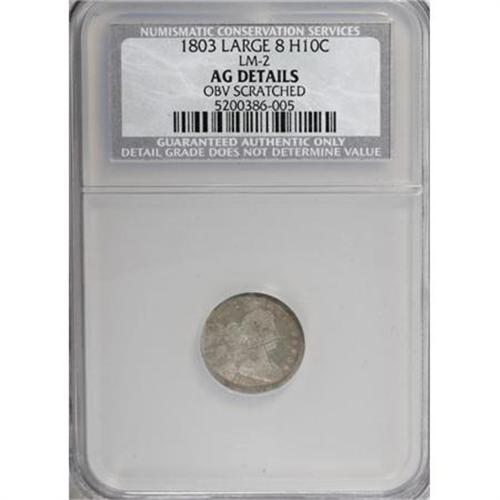 <B>1803 H10C Large 8--Obverse Scratched--NCS. AG Details.</B></I> LM-2. NGC Census: (0/34). PCGS Population (1/86). Mintage: 37,850. Numismedia Wsl. Price for NGC/PCGS coin in AG3 : $473. (#4269)<BR><BR><B>Coin Engraver:</B> Robert Scot<BR><BR><b>Shipping:</b> Coins & Currency (<a target="_blank" href="http://www.heritageauctions.com/common/shipping.php">view shipping information</a>)