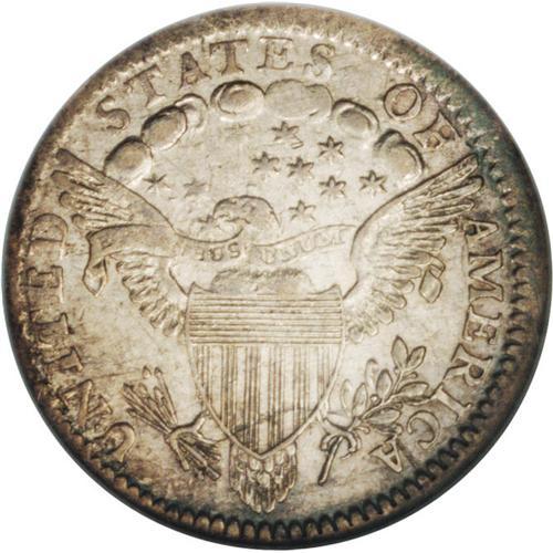 <B>1803<H10C> Large 8 AU55 NGC.</B></I> V-2, LM-3, R.3. A splendidly detailed piece with medium plum-gray and sea-green obverse toning and only light peripheral gray patina on the reverse. A couple of left side stars above the eagle are not fully impressed, but the overall strike is crisp. An interesting curved strike-through (as made) above the eagle's tail is mentioned for pedigree purposes.
