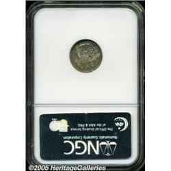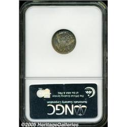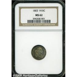 <B>1803 H10C Large 8 MS62 NGC.</B></I> LM-3, V-2, R.3. The recorded mintage for the year was 37,850 coins, and this mintage was accomplished through a combination of two obverse dies and two reverse dies. The reverse die of this variety was used again in 1805. Three die varieties are known for the 1803 half dimes and this is easily the most common variety, yet it is a rarity in Mint State grades. Even XF and AU examples of this issue are difficult to locate. This particular example is important for its overall condition, but also for its excellent strike. The obverse is slightly weak on the drapery, but all other design elements are boldly defined. Similarly, the reverse has sharp design details everywhere except for the fifth cloud. The surfaces have light abrasions, but are lustrous with a satiny appearance. Vivid gold, lilac, and blue toning over ivory color gives this coin a vibrant personality. The dies are essentially perfect with faint clash marks visible on both sides. This is an attractive and desirable example.