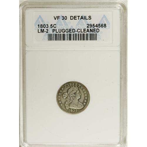 <B>1803 H10C Large 8--Plugged, Cleaned--ANACS. VF30 Details.</B></I> V-1, LM-2, R.4. Plugged over the IB in LIBERTY, although the letters are skillfully re-engraved. Bright and granular from whizzing, but partly retoned sea-green and golden-brown.<BR><I>From The Hoosier Discovery Collection.</B></I><BR><BR><b>Shipping:</b> Coins & Currency (<a target="_blank" href="http://www.heritageauctions.com/common/shipping.php">view shipping information</a>)