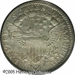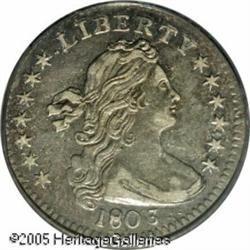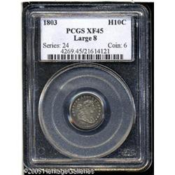 <B>1803 H10C Large 8 XF45 PCGS.</B></I> LM-3, V-2, R.3. Three die varieties are known for the coinage of 1803 half dimes, and these three combinations were utilized for the production of 37,850 coins. That quantity is the reported mintage for the year, and it is reasonable to assume that all of those coins were actually dated 1803. Unlike other denominations, the actual number of coins produced in a given year seems to be the same as the mintage bearing each date.<BR> This is an excellent example of the 1803 half dime coinage. The obverse has medium steel-blue toning intermingled with lighter gray color. The reverse is entirely bright silvery-gray with a faint trace of blue color near the border. Both sides have a few minor abrasions and faint scratches, typical of these coins. A semi-circular depression near the lower reverse appears to be the result of some type of pre-striking planchet flaw. Lot:6103