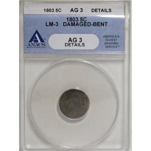 <B>1803 H10C Large 8--Damaged, Bent--ANACS. AG3 Details.</B></I> V-2, LM-3, R.3. This glossy example has a trio of small digs below the clouds, and moderate bends contribute to uneven wear. The reverse peripheral legends are largely legible. Deeply toned in rose-gray and forest-green.<BR><I>From The John Stimson, Sr. Collection, Part Two.</B></I><BR><BR><B>Coin Engraver:</B> Robert Scot<BR><BR><b>Shipping:</b> Coins & Currency (<a target="_blank" href="http://www.heritageauctions.com/common/shipping.php">view shipping information</a>)
