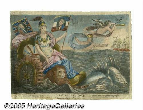 <B>1803 Hand-colored Mezzotint "Britannia's Glory"</B></I> <I>BRITANNIA'S GLORY Fame Proclaiming Peace.</B></I> Offered is a fine old print of 13.5" x 10" (sight size) in a modern mat. It was published by J. Hinton of London and is dated March 1, 1803. The caption reads <I>"Cheer up Brittania, dissipate all fears, Peace on the Borders from each coast appears, Let home bred Concord Britain's Peace complete. Let discord cease, malicious strife retreat."</B></I> The allegorical image shows a cherub blowing a trumpet and Britannia on the water carrying two flags being guided by King Neptune toward a row of ships, including one with an American flag. Condition is very good with some light soiling and light creasing, mostly in the lower border. Presents a fine appearance. Lot:253