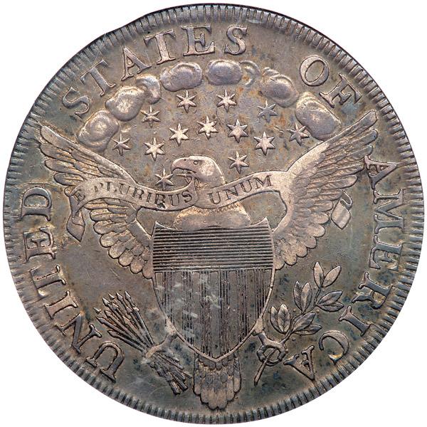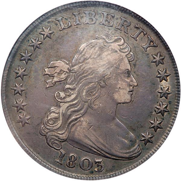 1803. Large 3. B-6, BB-255. Rarity 2. NGC graded EF-40. Pleasing old time toning on both sides. An original toned Bust Dollar of the most advantageous order for a collector. Its high degree of natural toning consists mainly of medium gray with lighter accents on the high points of the design. The fields are spared the usual heavy handling marks, what's more, they are free of defects and impurity streaks. Highlighted by the nice toning are clear relief designs, meaning that this one was nicely struck, too, with just a small amount of weakness at the usual Achilles' heel on the a few central hair curls. Large 3 in the date. This is the final year of issue. At President Jefferson's instruction, the mint ceased minting Silver Dollars because of a mismatch in the metallic content versus the international value of silver at the time. The mismatch caused coins to be exported almost as soon as they left the Mint.