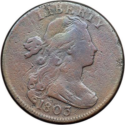 1803 NC-1 R5+. VG-7. Sharpness VG10 with very fine corrosion covering both sides, strongest on the reverse, where there are some shallow pitmarks at TE in STATES, in the leaves under IC in AMERICA, and right of that second A. The obverse is relatively smooth but does show minor roughness at the I in LIBERTY and at the rim opposite the chin. Lightly cleaned and retoned glossy chocolate with olive brown in protected areas. EDS, Breen state I, without the die crack through the tops of NITE. The date and legends are clear. Called VG8 net G5 and tied for CC#18 in the Noyes census, photo #25445. DWH #3096.
