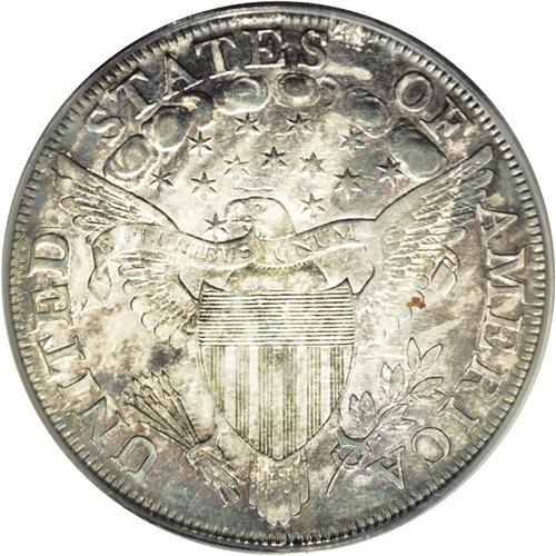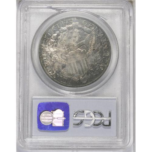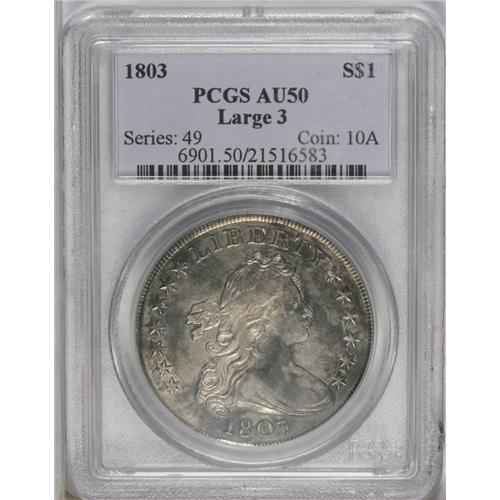 <B>1803<img border='0' src='http://www.heritagecoins.com/images/star.gif' width=10 height=10>$1> Large 3 AU50 PCGS.</B></I> B-6, BB-255, R.2. Splashes of aquamarine, golden-brown, and russet-gray coloration enrich this sharply struck and partly lustrous Draped Bust dollar. Light wear on Liberty's shoulder and the eagle's breast is customary for the grade. A pinscratch on the left (facing) wing provides a pedigree marker.