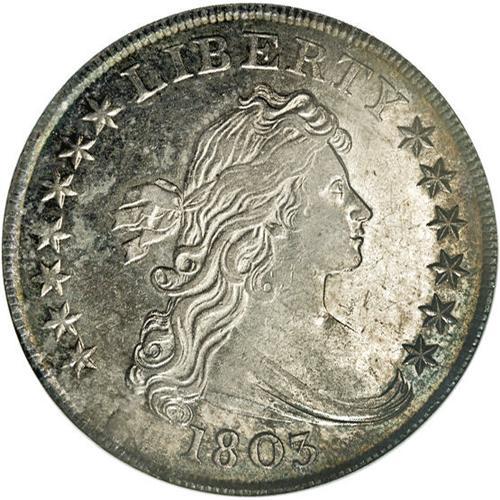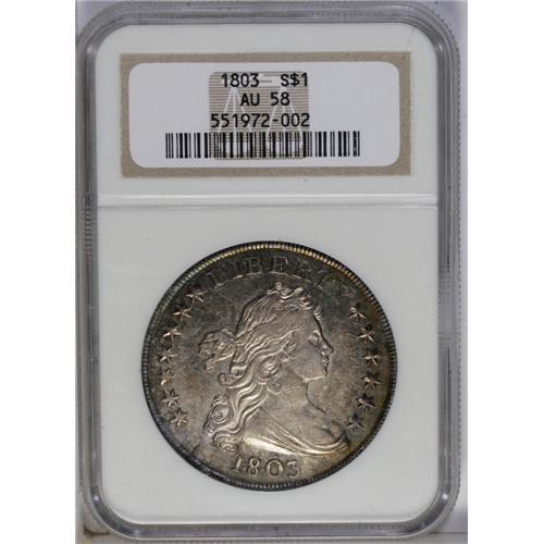 <B>1803<img border='0' src='http://www.heritagecoins.com/images/star.gif' width=10 height=10>$1> Large 3 AU58 NGC.</B></I> B-6, BB-255, R.1. A satiny and lustrous example of this popular dollar variety, the only die marriage from the Large 3 obverse, and a popular <I>Guide Book</B></I> listed variety. As such, extra demand is encountered for this single die marriage. Although the most common of the date, it is not easy to locate, especially in top grades. Light silver-gray surfaces with pale champagne color and peripheral iridescence. A splendid prooflike example.<BR><I>From The Royal Oak Collection.</B></I>