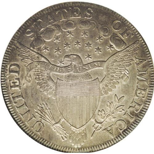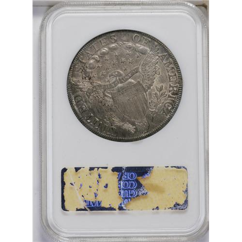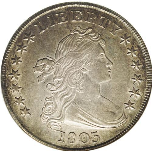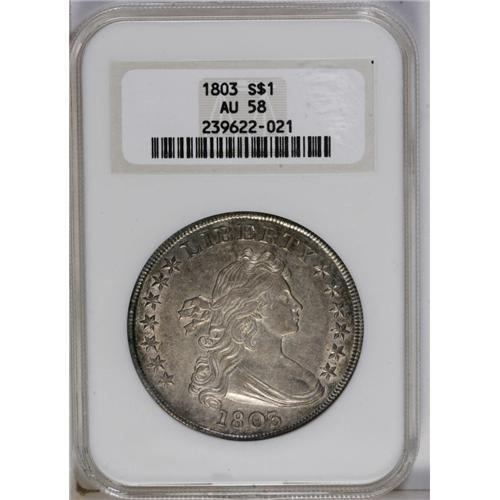 <B>1803<img border='0' src='http://www.heritagecoins.com/images/star.gif' width=10 height=10>$1> Large 3 AU58 NGC.</B></I> B-6, BB-255, R.1. The Large 3 variety is one of the common varieties among all early silver dollars from 1795 to 1803. Only one other early dollar variety, 1802 BB-241, is of similar availability. These two varieties are the perfect choices for date or type collectors, as there is no associated variety premium. This is a splendid dollar with satiny surfaces and virtually full luster. Both sides have attractive light gray color with considerable pale gold, blue, and iridescent toning.<BR><I>From The Royal Oak Collection.</B></I>