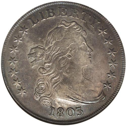 <B>1803 S$1 Large 3--Cleaned--ANACS. XF40 Details.</B></I> B-6, BB-255, R.2. Like many (most) early 19th century silver coins, this is the victim of an old cleaning, but it has retoned nicely in deep hues of pinkish-gray, with steel-blue near the rims. Considerable luster remains in evidence underneath, and the ANACS details assessment is close to the mark. All in all, an attractive example, despite ANACS' mild caveat.<BR><BR><b>Shipping:</b> Coins & Currency (<a target="_blank" href="http://www.heritageauctions.com/common/shipping.php">view shipping information</a>)