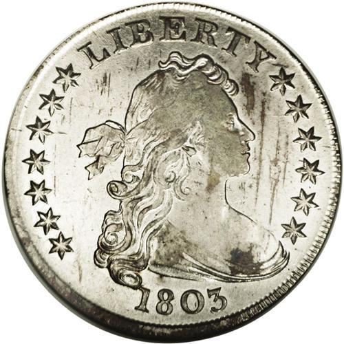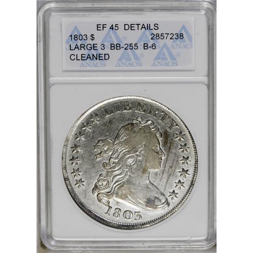 <B>1803<img border='0' src='http://www.heritagecoins.com/images/star.gif' width=10 height=10>$1> Large 3--Cleaned--ANACS. XF45 Details.</B></I> B-6, BB-255, R.2. A sharp example that displays substantial mint shimmer from selected areas. Mostly untoned, although a few golden-brown dashes are present, and the obverse fields exhibits delicate rose and lime tints. Bright from a past wipe, but still a desirable example of this collectible variety.