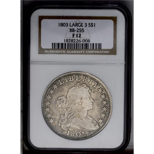 <B>1803<img border='0' src='http://www.heritagecoins.com/images/star.gif' width=10 height=10>$1> Large 3 Fine 12 NGC.</B></I> B-6, BB-255, R.1. A glossy charcoal-gray example of the sole Large 3 variety. There are a few unimportant marks, but these are fully appropriate for the grade. E PLURIBUS UNUM is mostly legible, and the devices display attractive definition. NGC BB-255 Population: 3 in Fine, 29 finer (3/06). <BR><BR><B>Important notice:</B> Heritage usually auctions material at the rate of 200-250 lots per hour. On some occasions eBay Live bid software or the Internet may not be able to keep up with the pace of the auction. We recommend placing a realistic absentee bid now as insurance to avoid disappointment. Occasionally the auctioneer may eliminate or reject an eBay Live bid, and the auctioneer may also reopen a lot after the close of the eBay live bidding (usually because we missed an audience bid), and may reject your bid even if it shows you as the winning bidder. By bidding via eBay Live, you agree that Heritage may award the lot to another bidder at its sole discretion under the circumstances described above or any other reasonable circumstances. Since eBay bids are not shown to us until we open the lot on the floor, we treat those bids just like floor bids. In most cases the floor responds before the eBay bid is presented to us, due to Internet lag time, so for consistency we have made it a policy that floor bids are always considered first over tie eBay live bids. Also please note that all Heritage lots purchased through eBay Live carry a 20% Buyer's Premium. Please make sure you read the Terms and Conditions before you bid. This lot is being auctioned in conjunction with a live floor auction by Heritage Galleries & Auctioneers. All final auction and invoice information will be supplied by Heritage Galleries & Auctioneers, and all other information should be considered preliminary. Lot:2162 <BR><BR><B>Winning Notification and Billing:</B> After the FINAL session in this auction is complete, Heritage will send e-mail and snail mail invoices. This process normally takes several days. All final auction and invoice information will be supplied by Heritage Galleries & Auctioneers, and all other information should be considered preliminary. <BR><BR>This auction will be conducted on a live auction floor and over the Internet through eBay Live. If you choose to place an absentee bid, please take a moment to <font color='#0000ff'><u><a href='http://pages.ebay.com/liveauctions/help/before/laabsentee.html'>learn how eBay Live absentee bidding works</a></u></font><font color='#000000'>