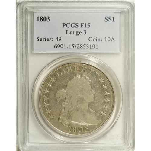 <B>1803 S$1 Large 3 Fine 15 PCGS.</B></I> B-6, BB-255, R.2. This significantly worn example has unusually reflective blue-gray fields and dulled rose-gray devices. Immensely appealing without many of the problems that so often plague early dollars.<BR><BR><b>Shipping:</b> Coins & Currency (<a target="_blank" href="http://www.heritageauctions.com/common/shipping.php">view shipping information</a>)