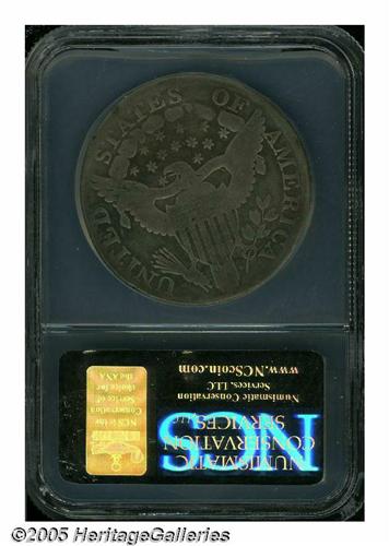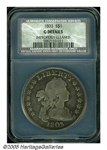<B>1803<S$1> Large 3 Good Details, Improperly Cleaned, NCS.</B></I> B-6. BB-255, R.1. A well worn example with a smooth appearance overall. A full rim remains on the obverse, some wear shows into selected letters on the reverse. A desirable, lower grade type coin selection.