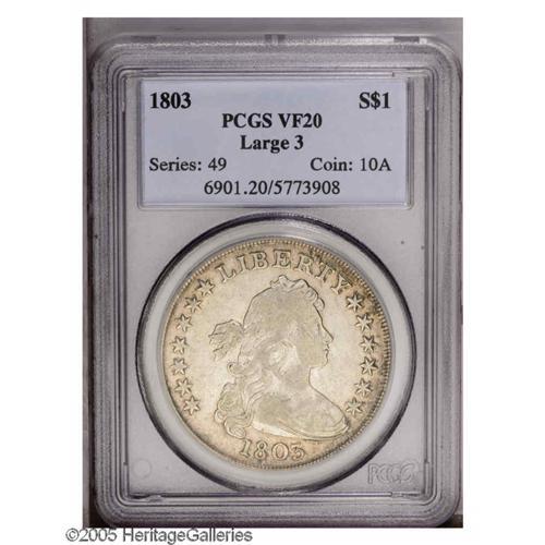 1803 S$1 Large 3 VF20 PCGS. B-6, BB-255, R.2. Quite sh 1803[S$1] Large 3 VF20 PCGS.