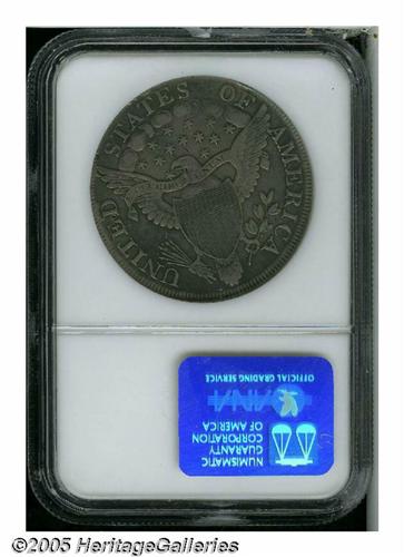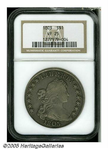 <B>1803<S$1> Large 3 VF25 NGC.</B></I> B-6, BB-255, R.1. This is the only known die marriage of the 1803 Large 3 Dollar, but it is also the most plentiful of the year. Medium intensity toning overlays both sides in well blended lilac-gray and steel-gray hues. There are a few scattered small abrasions, as well as some old, short pinscratches on Liberty's neck and cheek. The surfaces reveal moderate, even wear, and decent remaining detail. The impression is a little off center with the lower obverse and upper reverse denticles off the planchet.