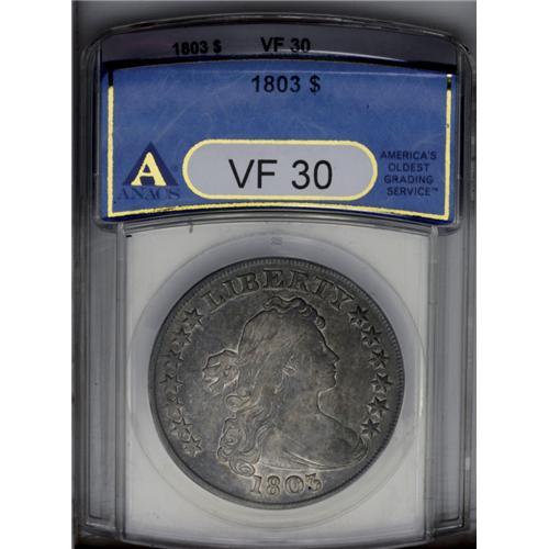 <B>1803<img border='0' src='http://www.heritagecoins.com/images/star.gif' width=10 height=10>$1> Large 3 VF30 ANACS.</B></I> B-6, BB-255, R.2. Richly detailed for the VF30 level, and glimpses of luster emerge from protected areas of the design. Thorough evaluation beneath a loupe fails to locate any marks remotely worthy of discussion. A pleasing and yet collectible example of this available Bolender die marriage. <BR><BR><B>Important notice:</B> Heritage usually auctions material at the rate of 200-250 lots per hour. On some occasions eBay Live bid software or the Internet may not be able to keep up with the pace of the auction. We recommend placing a realistic absentee bid now as insurance to avoid disappointment. Occasionally the auctioneer may eliminate or reject an eBay Live bid, and the auctioneer may also reopen a lot after the close of the eBay live bidding (usually because we missed an audience bid), and may reject your bid even if it shows you as the winning bidder. By bidding via eBay Live, you agree that Heritage may award the lot to another bidder at its sole discretion under the circumstances described above or any other reasonable circumstances. Since eBay bids are not shown to us until we open the lot on the floor, we treat those bids just like floor bids. In most cases the floor responds before the eBay bid is presented to us, due to Internet lag time, so for consistency we have made it a policy that floor bids are always considered first over tie eBay live bids. Also please note that all Heritage lots purchased through eBay Live carry a 20% Buyer's Premium. Please make sure you read the Terms and Conditions before you bid. This lot is being auctioned in conjunction with a live floor auction by Heritage Galleries & Auctioneers. All final auction and invoice information will be supplied by Heritage Galleries & Auctioneers, and all other information should be considered preliminary. Lot:2163 <BR><BR><B>Winning Notification and Billing:</B> After the FINAL session in this auction is complete, Heritage will send e-mail and snail mail invoices. This process normally takes several days. All final auction and invoice information will be supplied by Heritage Galleries & Auctioneers, and all other information should be considered preliminary. <BR><BR>This auction will be conducted on a live auction floor and over the Internet through eBay Live. If you choose to place an absentee bid, please take a moment to <font color='#0000ff'><u><a href='http://pages.ebay.com/liveauctions/help/before/laabsentee.html'>learn how eBay Live absentee bidding works</a></u></font><font color='#000000'>