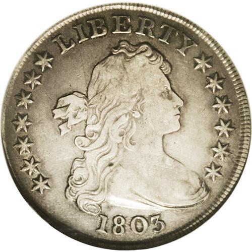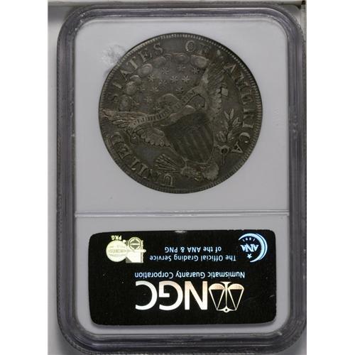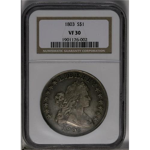 <B>1803<img border='0' src='http://www.heritagecoins.com/images/star.gif' width=10 height=10>$1> Large 3 VF30 NGC.</B></I> B-6, BB-255, R.2. Blended golden-brown and gunmetal-gray toning drapes this unmarked early dollar. All letters in E PLURIBUS UNUM are legible, and only the PLU shows substantial wear. Traces of luster glint from selected design recesses. The obverse field displays nearly imperceptible hairlines, but major marks are absent.<BR><I>From The Long Beach Family Collection.</B></I> <BR><BR><B>Important notic