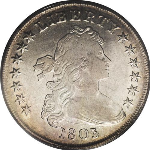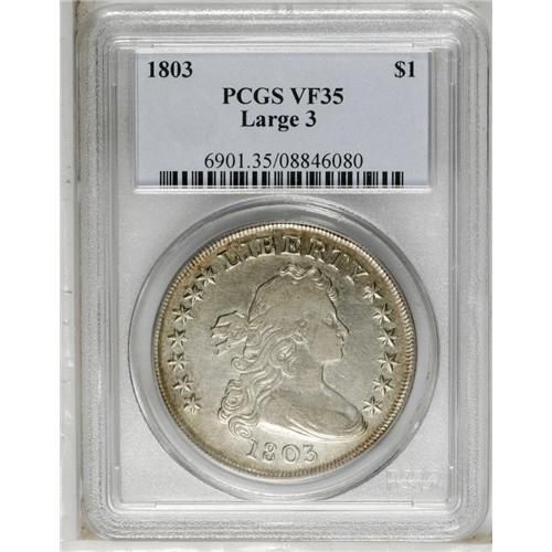<B>1803<img border='0' src='http://www.heritagecoins.com/images/star.gif' width=10 height=10>$1> Large 3 VF35 PCGS.</B></I> B-6, BB-255, R.1. Rotation of the piece beneath a light reveals numerous pockets of remaining luster. Gentle golden-brown toning near the borders further increases the eye appeal. Moderate wear on the cheek and shoulder is appropriate for the grade. A richly detailed yet affordable example of this popular early large silver type.