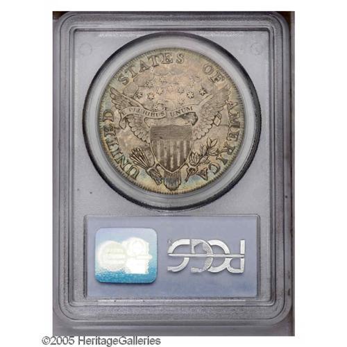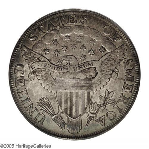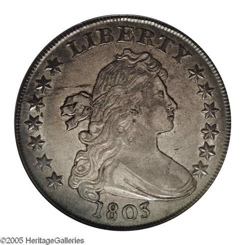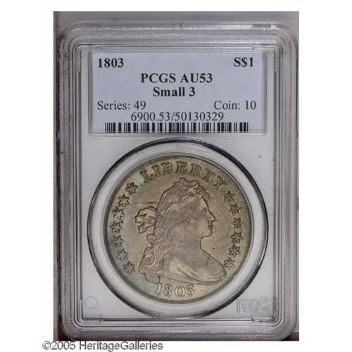 <B>1803<S$1> Small 3 AU53 PCGS.</B></I> B-4, BB-254, R.3. Dusky tan-gray and blue-green colors embrace this generally unmarked Early Dollar. Minor striking softness is limited to a couple of stars and clouds above the eagle. A few light roller marks (as made) are not struck out on the reverse, but do not distract. Traces of dark debris accompany reverse recesses. Regarding Bolender-4, Bowers states in his Silver Dollar Encyclopedia (1993), "No Mint State coins have come to our attention." Attractive AU pieces are thus the finest quality practically obtainable for the variety. Significantly scarcer than the Large 3 variety of the date. Population: 6 in 53, 23 finer (11/05).