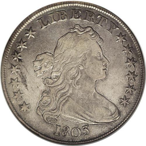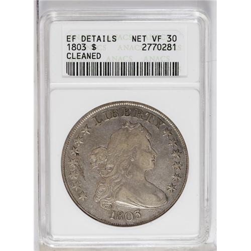 <B>1803<img border='0' src='http://www.heritagecoins.com/images/star.gif' width=10 height=10>$1> Small 3--Cleaned--ANACS. XF Details, Net VF30.</B></I> B-5, BB-252, R.3. The surfaces are a little dull from the stated cleaning and a couple of grease stains are noted at the left side of the obverse. Some crisscrossing scratches are seen at the center of the reverse, however, these should not be confused with mint-made adjustment marks. Light gray-rose color overall, a well centered specimen.