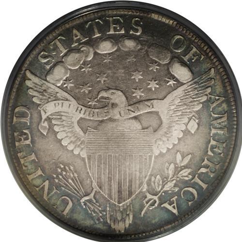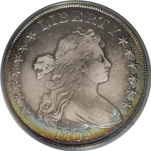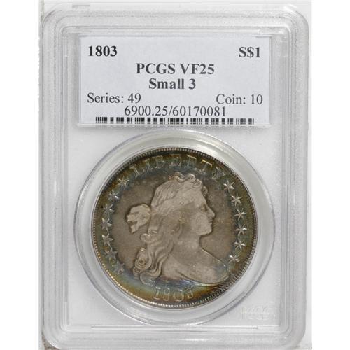 <B>1803<img border='0' src='http://www.heritagecoins.com/images/star.gif' width=10 height=10>$1> Small 3 VF25 PCGS.</B></I> B-5, BB-252, R.3. A band of rainbow toning encircles the outer edges of this coin, with the moderately worn interiors remaining in various shades of gray. A bit unevenly struck above the eagle's head. The surfaces are pleasing and unmarked for the grade.