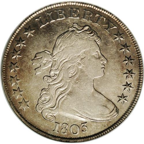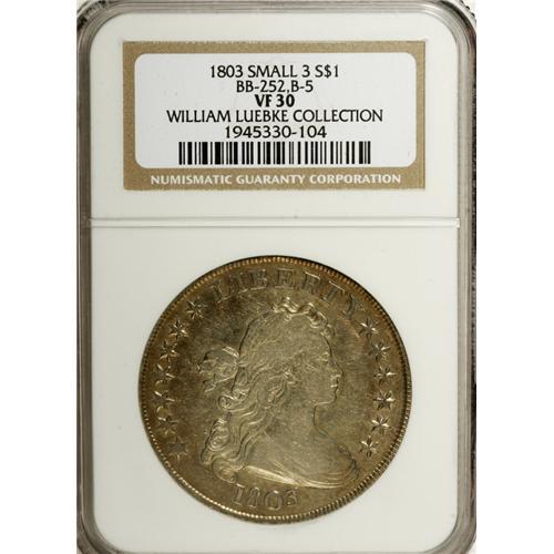 <B>1803 S$1 Small 3 VF30 NGC.</B></I> B-5, BB-252, R.3. Die State I. Stars 1 and 7 distant from curl and L, stars 8 and 13 closer to Y and bust; projection at lower right curve of D. This example has a perfect obverse die as always. Like so many other early dollar varieties, a few Mint State or AU pieces are known, although the majority of survivors grade in the Fine to XF range. Light gray surfaces with rich gold toning and traces of luster in the protected areas around the devices. Both sides have scattered surface marks and a few wispy scratches.<BR><I>Ex: Alpine Numismatics (5/2005).</B></I><BR><I>From The William Luebke Collection.</B></I><BR><BR><b>Shipping:</b> Coin/Currency (<a target="_blank" href="http://www.heritageauctions.com/common/shipping.php">view shipping information</a>)