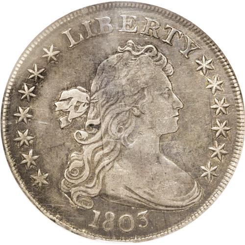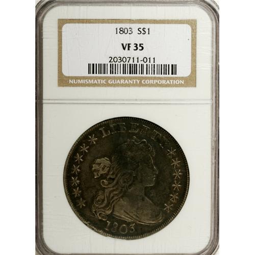 <B>1803 S$1 Small 3 VF35 NGC.</B></I> B-5, BB-252, R.3. The 3 is high, with a thin top, and nearly touches the bust. A small spur of metal protrudes from the outside of the D in UNITED. Steel-gray and charcoal-gray alternate with silver highpoints on this Choice VF coin. A few light adjustment marks show on the reverse, scarcely visible without a loupe.<BR><BR><b>Shipping:</b> Coin/Currency (<a target="_blank" href="http://www.heritageauctions.com/common/shipping.php">view shipping information</a>)