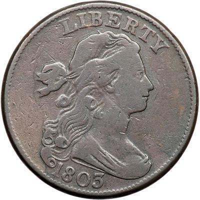1803 S-243 R2+ Stemless Wreath with Double Fraction Bar. VG-8. A few points sharper but nicely retoned a glossy chocolate brown with some underlying lighter brown tones in protected areas of the reverse. There is a faint, thin scuff from the earlobe to the throat and a few very light, dull scratches on the upper reverse. None of these marks is at all distracting and the overall eye appeal of this cent is very nice for the grade. The date, legends, and stemless wreath error are all bold. EDS, Breen state II. Most of the die clashmarks at RICA have been lapped off the die, but the narrow rim cud right of the Y in LIBERTY has not formed. DWH #0281.