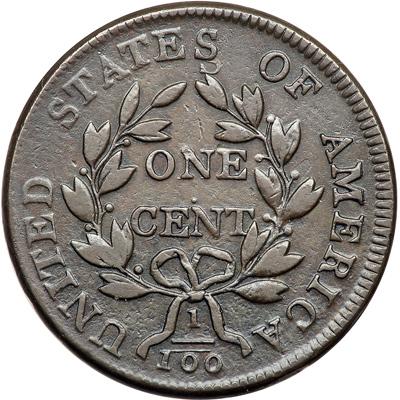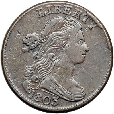 1803 S-243 R2+ Stemless Wreath with Double Fraction Bar. VF-20. Sharpness VF25 or slightly better with traces of microscopic roughness under a glossy chocolate brown patina. There are specks of darker olive brown toning sprinkled about the obverse plus a small spot of very fine carbon in the field before the eye. Decent eye appeal in spite of the minor defects. LDS, Breen state V. The rim cud breaks at TY and before the forehead are clear and the one at TY joins the tops of those letters to the rim above. The stemless wreath and double fraction bar features are strong. DWH #2837.