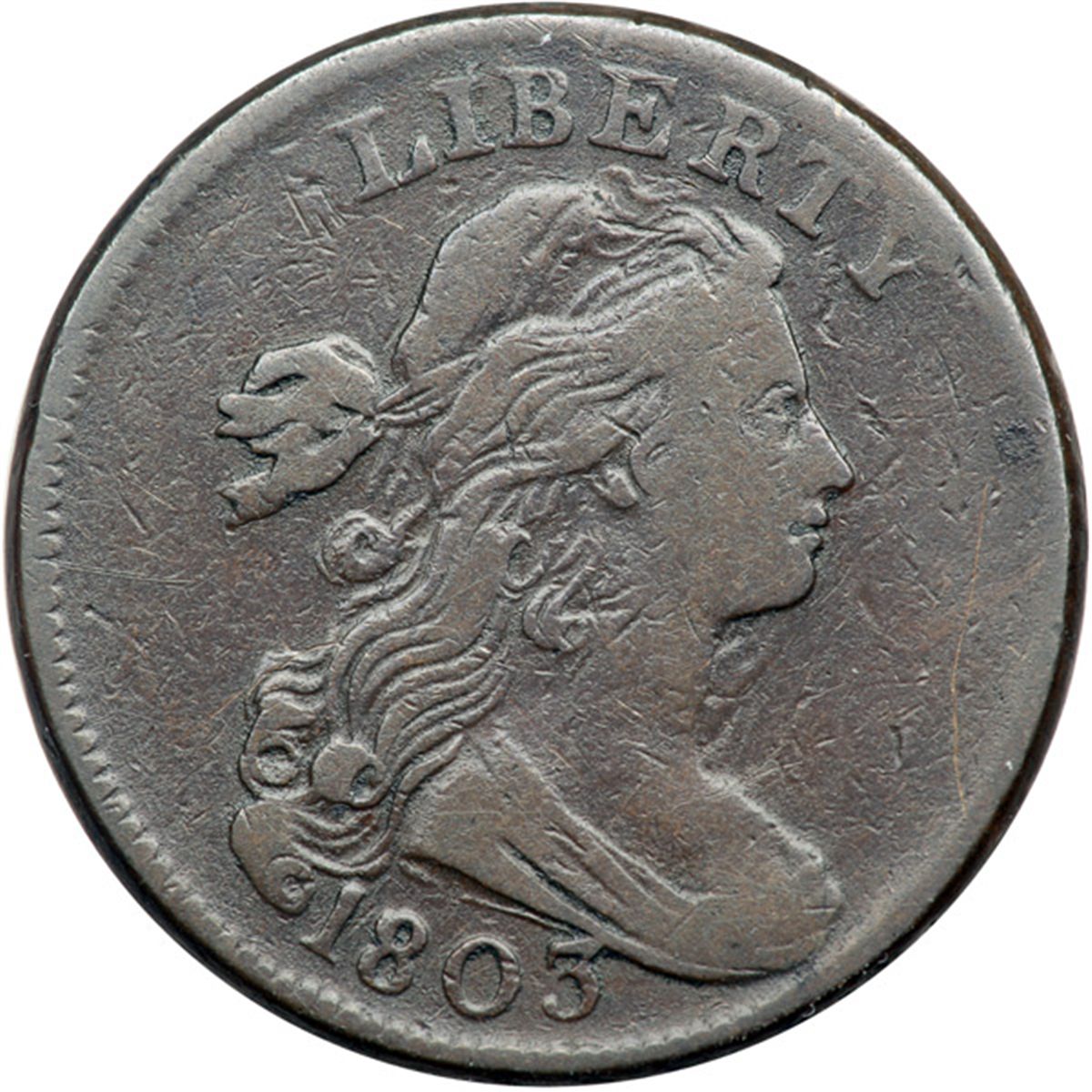 1803 S-244 R4 F12. Glossy medium chocolate brown. No roughness or verdigris, only small contact marks scattered over both sides, none notable. An attractive, well balanced example of this tough die variety.