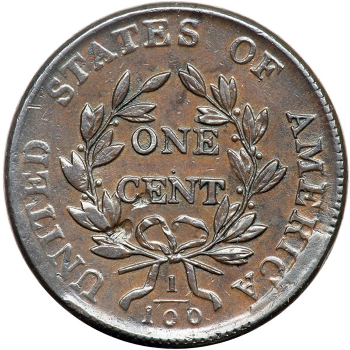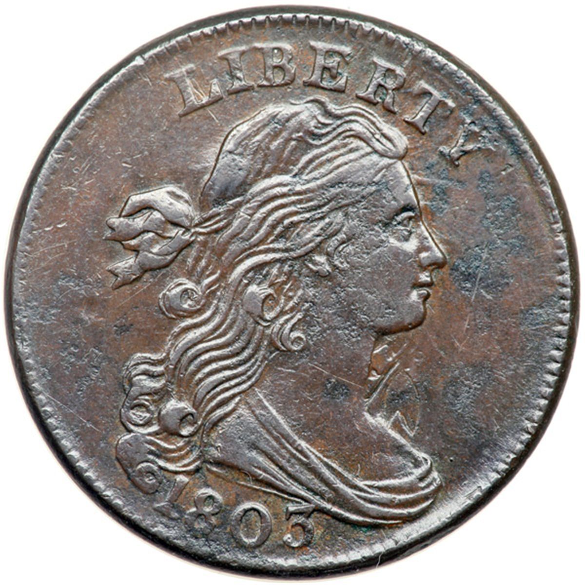1803 S-245 R3 VF20. Sharpness EF45 but there is shallow pitting and planchet erosion scattered over the obverse while the reverse is smooth and very attractive. The only notable marks are two rather deep digs or dents at the bottom of CE in CENT. Glossy chocolate brown with darker olive toning in the roughened areas on the obverse and lighter brown tones in protected areas on the reverse. LDS, Breen state III, with a strong cud break connecting RICA to the rim above. Breen calls this terminal die state "Very Rare."