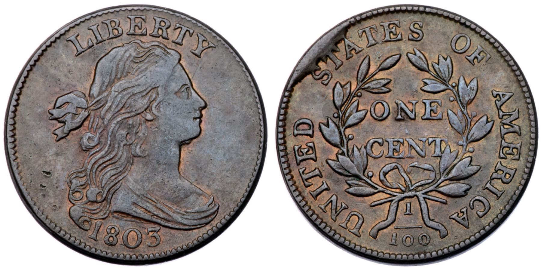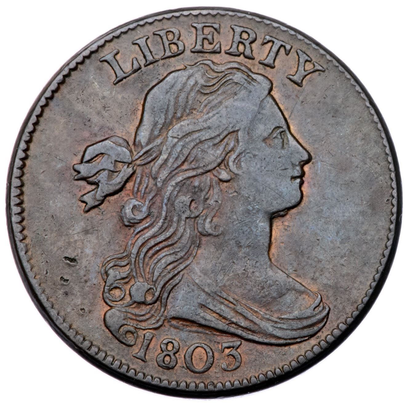 1803 S-246 R-3 VF25Slightly sharper but there are three small nicks left of the lower curls. Otherwise void of notable marks with smooth, attractive surfaces. Glossy olive brown and steel with frosty lighter brown and tan in protected areas. LDS, Breen state IV, with a cud break at STA. Graded VF25 net VF20 and tied for CC#13 overall but second finest of the LDS in the Noyes census, his photo #34244.Certificate Number: Pedigree: From the Fred H. Borcherdt Collection