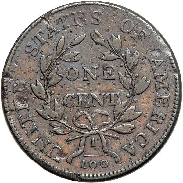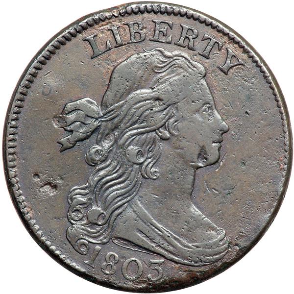 1803 S-246 R3. VG-10. Sharpness VF35 but there are numerous dull nicks and small pitmarks scattered over both sides. The rim under the bust is slightly eroded, a trio of obvious pitmarks is located in the field left of the lower curls, and a dent on the E in UNITED causes minor swelling in the field above the hair ribbon. Great detail, but not especially attractive thanks to the marks. Glossy chocolate and steel with reddish chocolate toning in some of the protected areas. EDS, Breen state I, before the "Mumps" lumps at the throat.