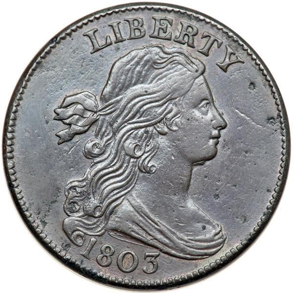 1803 S-247 R3 F15. Sharpness EF45 but there are a dozen small, shallow pits on the obverse plus a couple larger ones on the reverse, and fine corrosion covers the lower right part of the reverse. The obverse fields are covered with fine hairline scratches that have been mostly burnished away, all in an attempt to minimize the effects of the pitting. Glossy chocolate and steel brown. The details remain quite sharp and the eye appeal is not as bad as the description might imply. Nonetheless, this piece is far from perfect. EDS, Breen state I. The "Mumps" lump at the throat is clear.