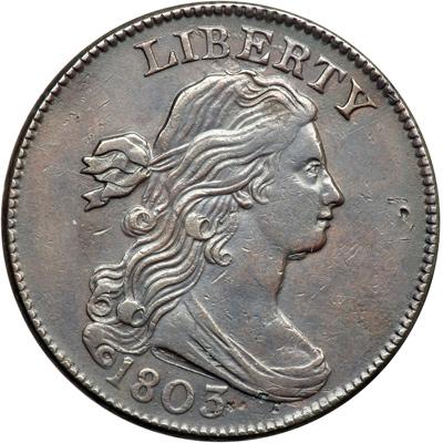 1803 S-247 R3. VF-25 Plus. Mumps Obverse. Sharpness EF40 but this cent was lightly cleaned and is retoned glossy steel brown and dark chocolate. The surfaces are smooth and attractive except for a few tiny pitmarks right of the date, a rather large pinprick in the field off the tip of the nose, a couple hairlines over ENT in CENT, and patches of microscopic roughness at the fraction and OF. The "Mumps" break at the throat is clear. Sharply struck LDS, Breen state III early. The die crack at NIT is clear and another clear crack reaches from the dentils to the U but this crack does not extend to the dentils over the adjacent N.
