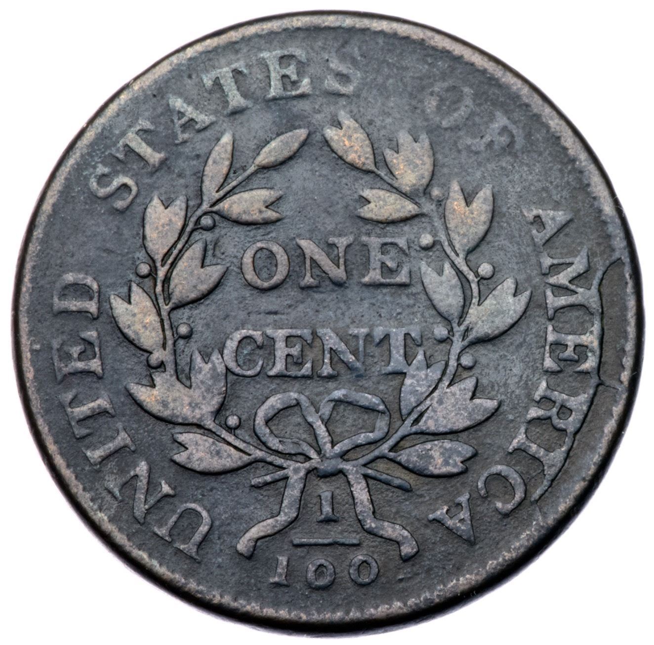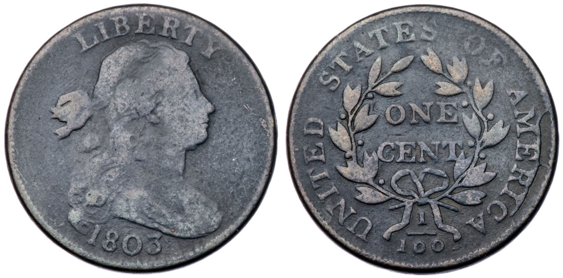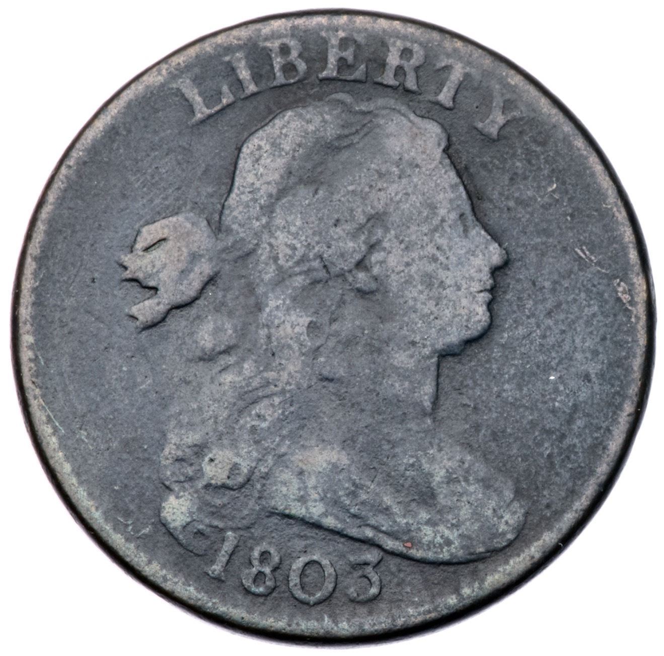 1803 S-248 R-4 G6+Slightly sharper but covered with fine roughness under rather glossy dark steel and olive brown with lighter steel on the highpoints. No marks or notable evidence of verdigris, and the reverse has the sharpness of at least VG10. The date and legends are complete and clear. Extremely rare TDS, Breen state III, with a strong die crack through the tops of MERI and a radial crack to the rim from the junction of the E & R. The area outlined by the crack is slightly sunken indicating this has become a retained cud. Graded VG8 net G6 and finest of the terminal die state in the Noyes census, his photo #32609.Certificate Number: Pedigree: From the Fred H. Borcherdt Collection
