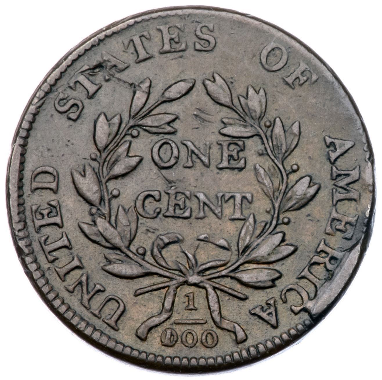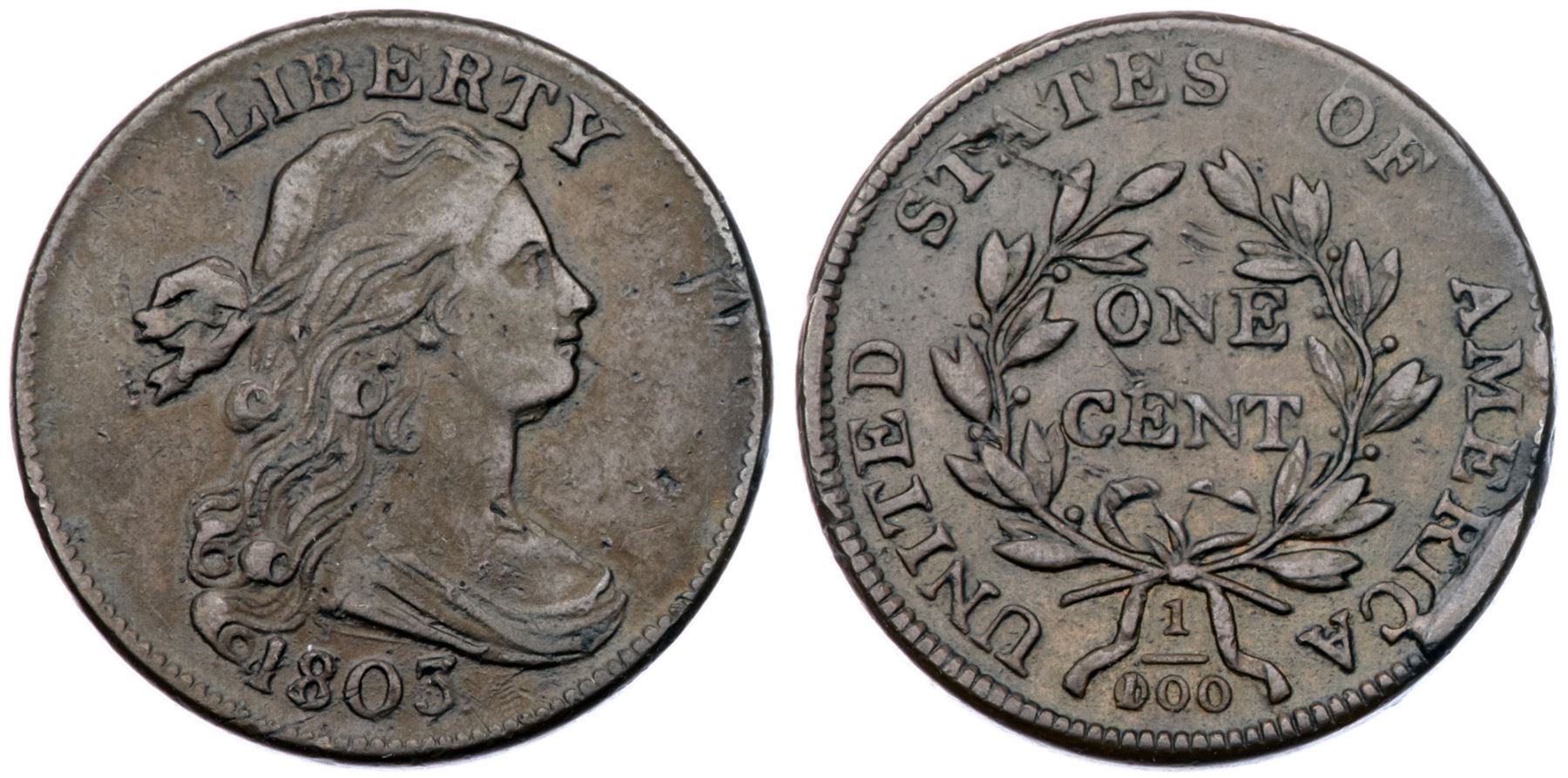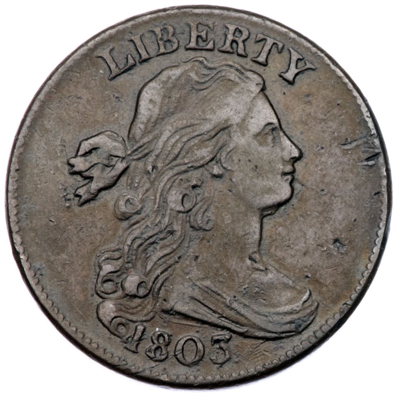 1803 S-249 R-2 F12Sharpness VF25 with smooth surfaces and attractive toning, but there are numerous contact marks, and some of them do catch your eye. There is a collection of small nicks in the field before the portrait, a rather strong vertical nick at the upper end of the hair ribbon, a dig at ST in STATES, and two small rim bumps at ME in AMERICA. Glossy brown and light olive blending to light chocolate in protected areas. No hint of corrosion or verdigris. Very rare M-LDS, Breen state V, with a strong cud break connecting RIC to the rim but without a cud at the bust tip. Graded VF25 net F12 and finest of only three known in the Noyes census, his photo #26036.Certificate Number: Pedigree: Ex James R. McGuigan 1/1981-Fred H. Borcherdt Collection