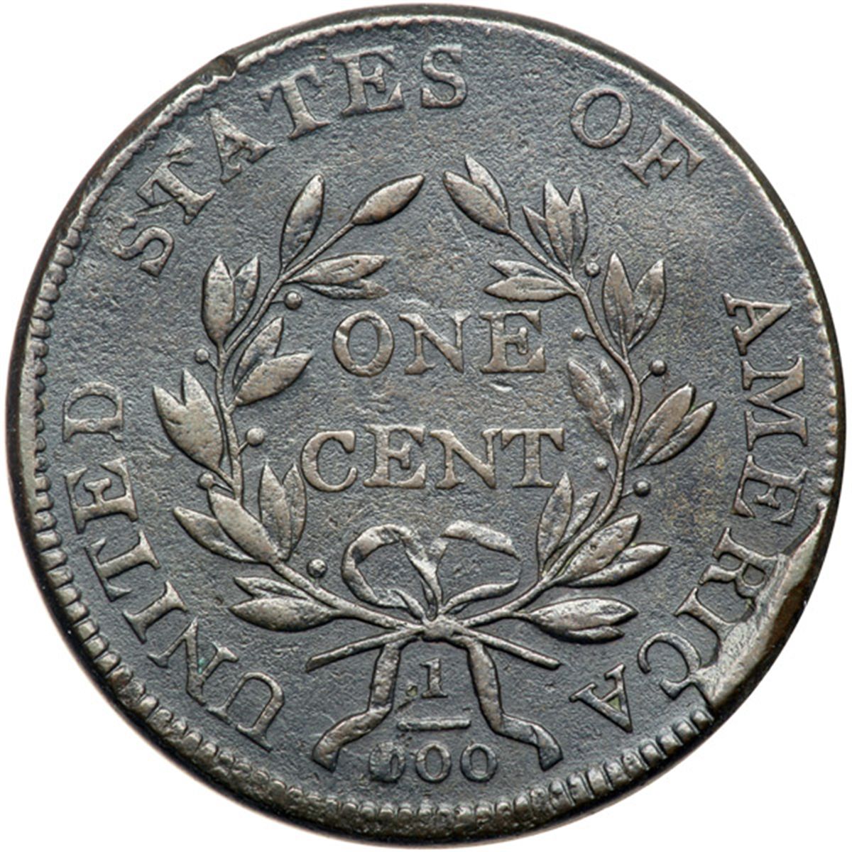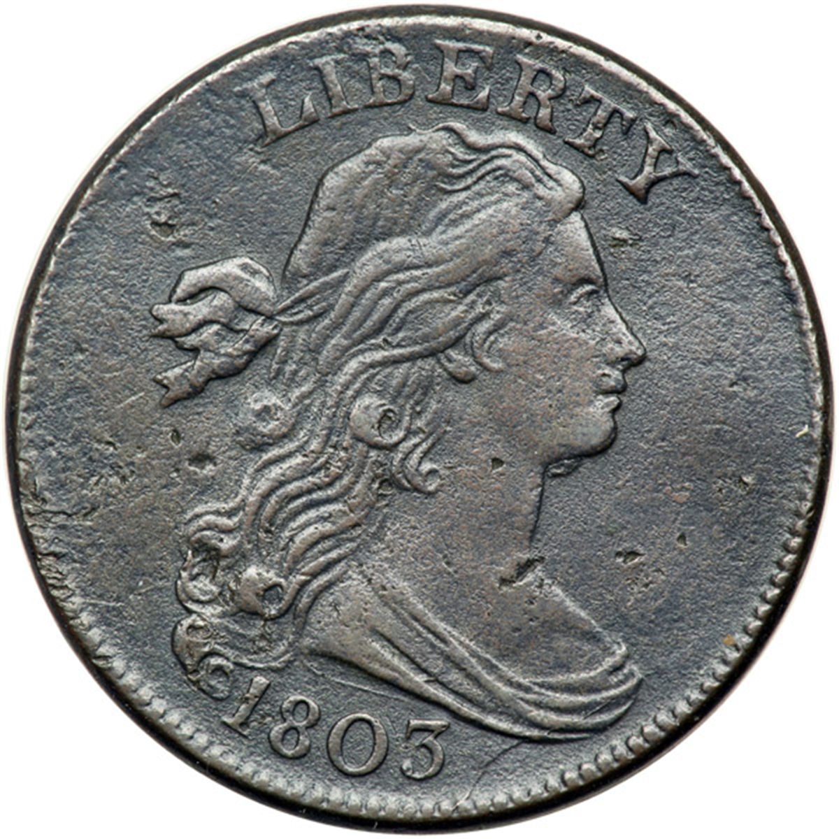 1803 S-249 R2 Corrected Fraction 100 over 000 F15. Sharpness EF40 but covered with fine roughness, strongest in the field behind the portrait. No verdigris, but there are some contact marks, including a scuff on the rim left of the middle curls and a nick at the base of the neck. Slightly glossy dark olive with dark steel brown toning on the devices. Rare M-LDS, Breen state V. A strong cud break connects RIC to the rim, but the cud break at the bust tip has not formed. The "Mumps" break under the chin is clear.
