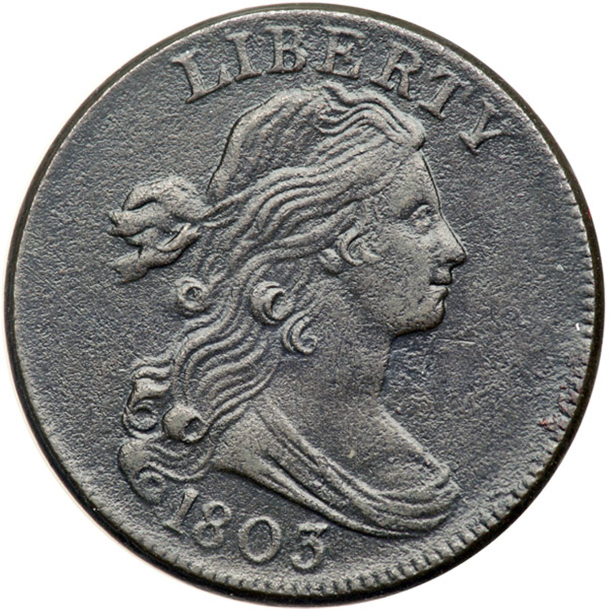 1803 S-250 R3 VF25. Sharpness EF45 but covered with uniform fine granularity under a rather glossy dark olive brown and chocolate patina. There are a few microscopic specks of verdigris on both sides. The only signs of contact are some faint vertical scuff marks on the neck.