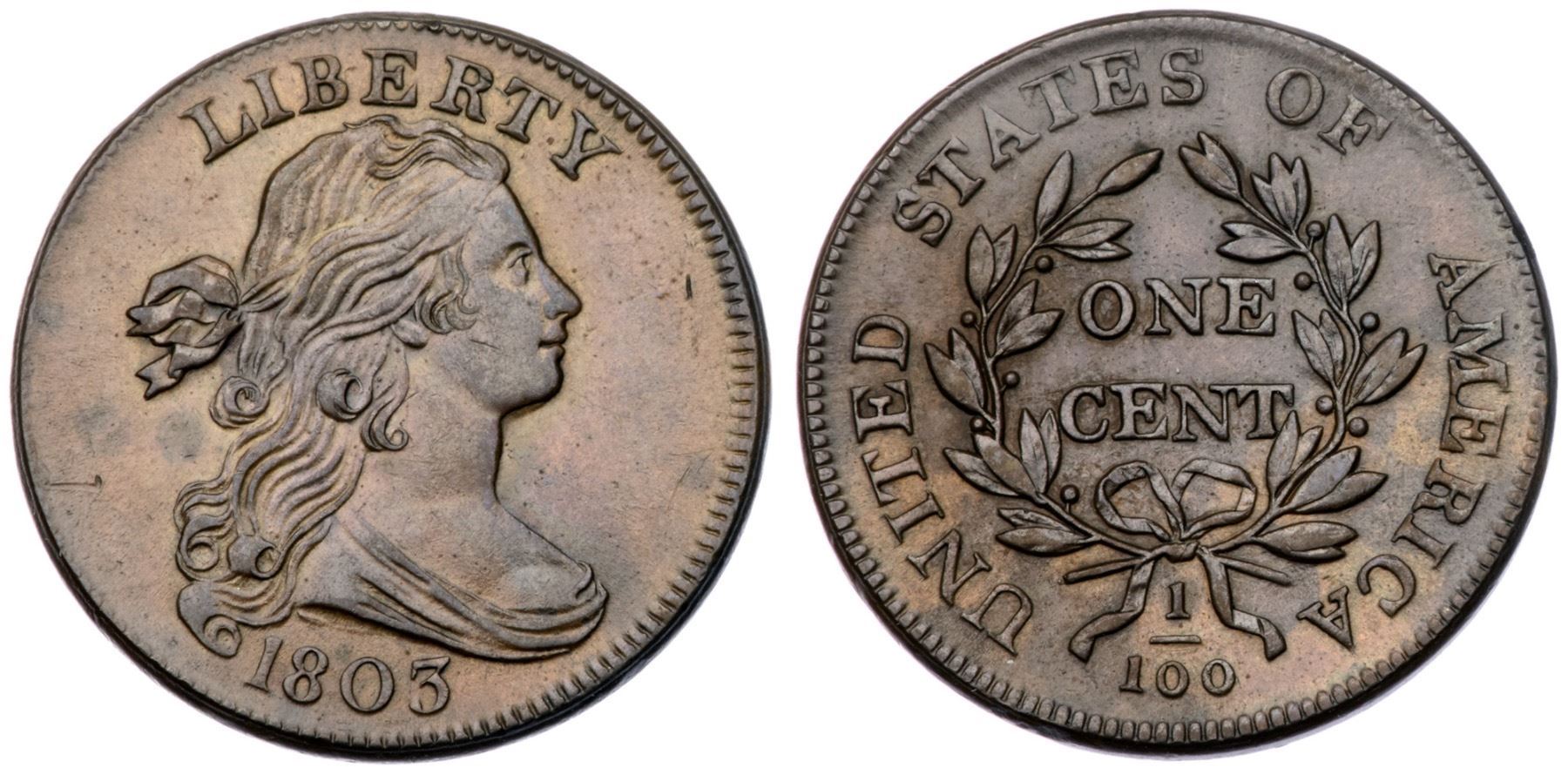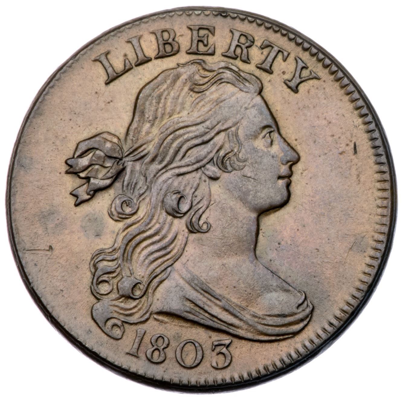 1803 S-251 R-2 VF35Ten points sharper but there is a short, dull scratch near the rim left of the lower curls, a tiny nick on the cheek, and a couple more near the dentils off the end of the nose. The reverse is flawless. Glossy light chocolate brown and tan. The lighter color dominates the obverse while chocolate covers most of the reverse. The toning is uneven and that does affect the eye appeal, but there is no trace of roughness on this cent. E-MDS, Breen state II, with clashmarks but no cracks on the reverse. Comes with a great provenance.Certificate Number: Pedigree: Ex Howard R. Newcomb-George H. Clapp-ANS Museum Collection (part of the legal settlement with Naftzger for cents reportedly switched out by Dr. Sheldon decades earlier) 2001-R. E. "Ted" Naftzger, Jr. (via William C. Noyes)-Fred H. Borcherdt Collection