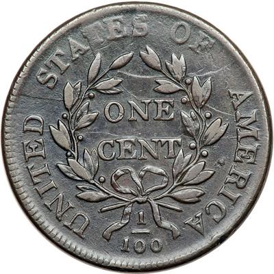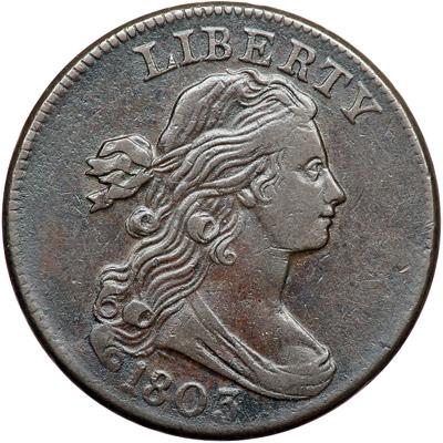 1803 S-251 R3-. VF-25. Glossy chocolate and olive brown. The surfaces are smooth and attractive, but there is a small spot of corrosion or verdigris under the left upright of the R in AMERICA. LDS, Breen state V. The upper half of the reverse die is shattered, and the area at TE in STATES is a slightly sunken retained cud. DWH #2840.