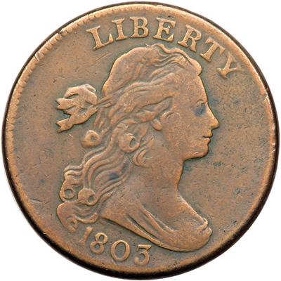 1803 S-251 R3-. NGC graded VG-10. A couple points sharper with some extremely fine roughness in the fields, mostly on the reverse. Attractive glossy chocolate brown but probably retoned. Date and legends strong. M-LDS, Breen state IV, with a couple fine horizontal die cracks through the tops of NE in ONE and NT in CENT to the right. This cent might not rate a place in this sale except for its "story." This particular coin was carried by Dan Holmes during 2003 as a pocket piece to show a "200 year old penny" to any one interested in or willing to hear about and see a piece of our history. It was always carried in his left pocket with no other coins. During the year the surface and color improved a fair amount. Dan says these coins are only worth a cent, but you may have to pay a premium for the story that comes with them. DWH #0291.
