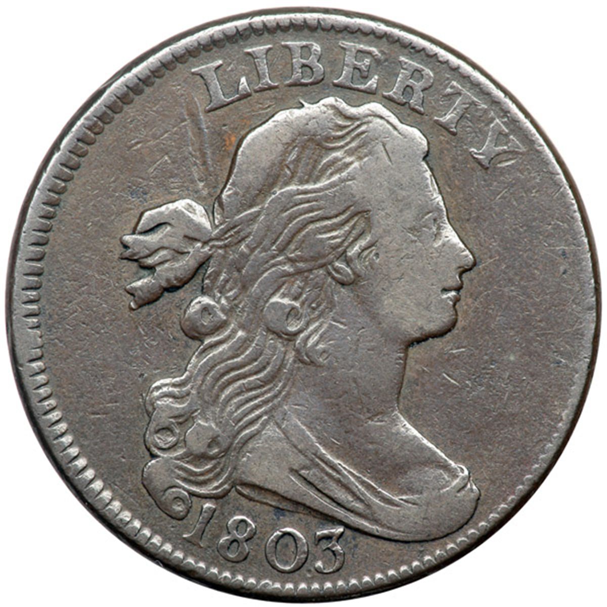 1803 S-252 R2 F12. Very slightly sharper but there is a dull scratch in the field behind the head. Otherwise the surfaces and eye appeal of this cent are quite nice. Glossy chocolate brown and steel. EDS, Breen state I.